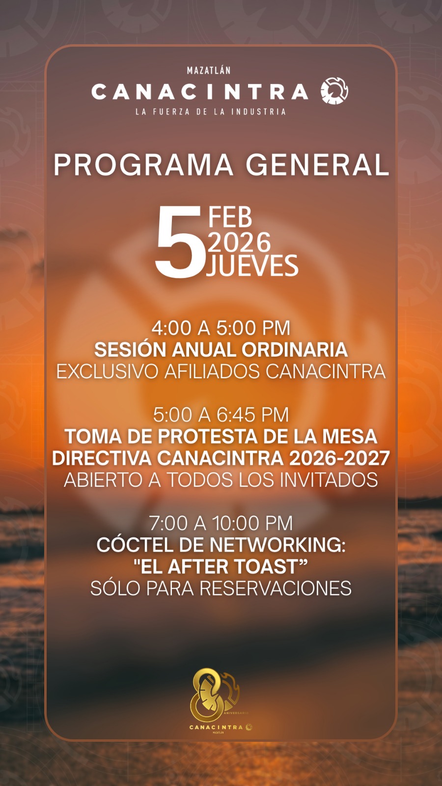 JUEVES 5 DE FEBRERO DE 2026 | SHEKINAH BEACH CLUB, MAZATLÁN CÓDIGO DE VESTIMENTA: FORMAL DE PLAYA Damas: Considerar calzado de jardín Caballeros: Considerar Guayabera EVENTOS: 🔹 1. SESIÓN ANUAL ORDINARIA (4:00–5:00 PM) Exclusiva para afiliados CANACINTRA Primera convocatoria: 4:00 PM Segunda convocatoria: 4:30 PM …